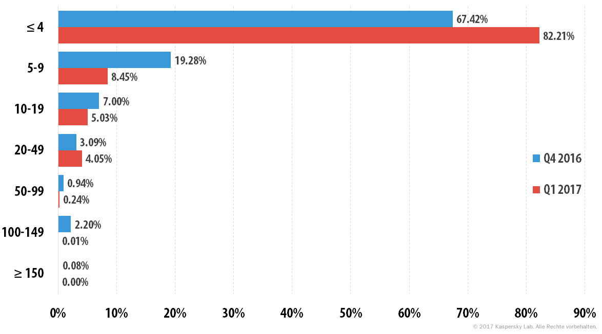 Im ersten Quartal des Jahres 2017 gab es fast keine Attacken mit einer Dauer von mehr als 100 Stunden. Der größte Anteil (82,21%) entfiel auf Angriffe, die 4 Stunden und weniger andauerten, das sind um 14,79 Prozentpunkte mehr als im vorangegangenen Quartal. Deutlich abgenommen hat der Anteil von Attacken mit einer Dauer zwischen 50 und 99 Stunden (von 0,94 auf 0,24 Prozent) ebenso wie der Anteil der Angriffe mit einer Dauer zwischen 5 und 9 Stunden (von 19,28 auf 8,45 Prozent) und der Attacken mit einer Dauer zwischen 10 und 19 Stunden (Rückgang von 7,00 auf 5,03 Prozent). Der Anteil der Angriffe, die zwischen 20 und 49 Stunden andauern, hat geringfügig zugenommen, und zwar um einen Prozentpunkt.